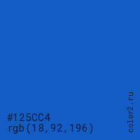 Цвет #125CC4 в цветовой модели RGB обозначается тремя октетами (18, 92, 196) в десятичном формате и #125CC4 в шестнадцатиричном (hex) формате, которые являются интенсивностью красного 18 (hex 12), интенсивность зелёного 92 (hex 5C) и интенсивность синего 196 (hex C4).