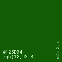 Цвет #125D04 в цветовой модели RGB обозначается тремя октетами (18, 93, 4) в десятичном формате и #125D04 в шестнадцатиричном (hex) формате, которые являются интенсивностью красного 18 (hex 12), интенсивность зелёного 93 (hex 5D) и интенсивность синего 4 (hex 04).