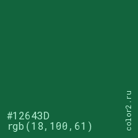 Цвет #12643D в цветовой модели RGB обозначается тремя октетами (18, 100, 61) в десятичном формате и #12643D в шестнадцатиричном (hex) формате, которые являются интенсивностью красного 18 (hex 12), интенсивность зелёного 100 (hex 64) и интенсивность синего 61 (hex 3D).