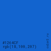 Цвет #1264CF в цветовой модели RGB обозначается тремя октетами (18, 100, 207) в десятичном формате и #1264CF в шестнадцатиричном (hex) формате, которые являются интенсивностью красного 18 (hex 12), интенсивность зелёного 100 (hex 64) и интенсивность синего 207 (hex CF).