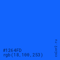 Цвет #1264FD в цветовой модели RGB обозначается тремя октетами (18, 100, 253) в десятичном формате и #1264FD в шестнадцатиричном (hex) формате, которые являются интенсивностью красного 18 (hex 12), интенсивность зелёного 100 (hex 64) и интенсивность синего 253 (hex FD).