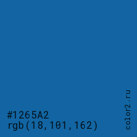 Цвет #1265A2 в цветовой модели RGB обозначается тремя октетами (18, 101, 162) в десятичном формате и #1265A2 в шестнадцатиричном (hex) формате, которые являются интенсивностью красного 18 (hex 12), интенсивность зелёного 101 (hex 65) и интенсивность синего 162 (hex A2).