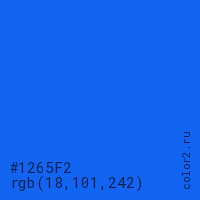 Цвет #1265F2 в цветовой модели RGB обозначается тремя октетами (18, 101, 242) в десятичном формате и #1265F2 в шестнадцатиричном (hex) формате, которые являются интенсивностью красного 18 (hex 12), интенсивность зелёного 101 (hex 65) и интенсивность синего 242 (hex F2).