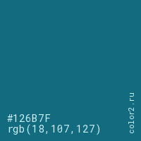 Цвет #126B7F в цветовой модели RGB обозначается тремя октетами (18, 107, 127) в десятичном формате и #126B7F в шестнадцатиричном (hex) формате, которые являются интенсивностью красного 18 (hex 12), интенсивность зелёного 107 (hex 6B) и интенсивность синего 127 (hex 7F).
