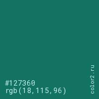 Цвет #127360 в цветовой модели RGB обозначается тремя октетами (18, 115, 96) в десятичном формате и #127360 в шестнадцатиричном (hex) формате, которые являются интенсивностью красного 18 (hex 12), интенсивность зелёного 115 (hex 73) и интенсивность синего 96 (hex 60).