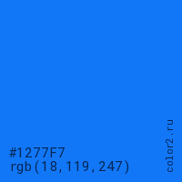 Цвет #1277F7 в цветовой модели RGB обозначается тремя октетами (18, 119, 247) в десятичном формате и #1277F7 в шестнадцатиричном (hex) формате, которые являются интенсивностью красного 18 (hex 12), интенсивность зелёного 119 (hex 77) и интенсивность синего 247 (hex F7).