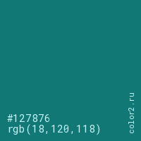 Цвет #127876 в цветовой модели RGB обозначается тремя октетами (18, 120, 118) в десятичном формате и #127876 в шестнадцатиричном (hex) формате, которые являются интенсивностью красного 18 (hex 12), интенсивность зелёного 120 (hex 78) и интенсивность синего 118 (hex 76).