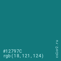 Цвет #12797C в цветовой модели RGB обозначается тремя октетами (18, 121, 124) в десятичном формате и #12797C в шестнадцатиричном (hex) формате, которые являются интенсивностью красного 18 (hex 12), интенсивность зелёного 121 (hex 79) и интенсивность синего 124 (hex 7C).