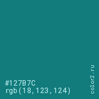Цвет #127B7C в цветовой модели RGB обозначается тремя октетами (18, 123, 124) в десятичном формате и #127B7C в шестнадцатиричном (hex) формате, которые являются интенсивностью красного 18 (hex 12), интенсивность зелёного 123 (hex 7B) и интенсивность синего 124 (hex 7C).