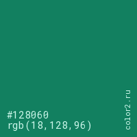 Цвет #128060 в цветовой модели RGB обозначается тремя октетами (18, 128, 96) в десятичном формате и #128060 в шестнадцатиричном (hex) формате, которые являются интенсивностью красного 18 (hex 12), интенсивность зелёного 128 (hex 80) и интенсивность синего 96 (hex 60).
