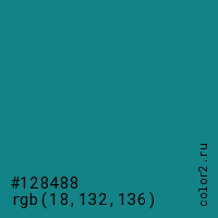 Цвет #128488 в цветовой модели RGB обозначается тремя октетами (18, 132, 136) в десятичном формате и #128488 в шестнадцатиричном (hex) формате, которые являются интенсивностью красного 18 (hex 12), интенсивность зелёного 132 (hex 84) и интенсивность синего 136 (hex 88).