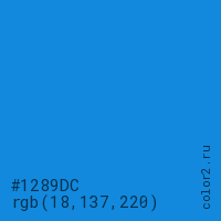 Цвет #1289DC в цветовой модели RGB обозначается тремя октетами (18, 137, 220) в десятичном формате и #1289DC в шестнадцатиричном (hex) формате, которые являются интенсивностью красного 18 (hex 12), интенсивность зелёного 137 (hex 89) и интенсивность синего 220 (hex DC).