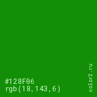 Цвет #128F06 в цветовой модели RGB обозначается тремя октетами (18, 143, 6) в десятичном формате и #128F06 в шестнадцатиричном (hex) формате, которые являются интенсивностью красного 18 (hex 12), интенсивность зелёного 143 (hex 8F) и интенсивность синего 6 (hex 06).