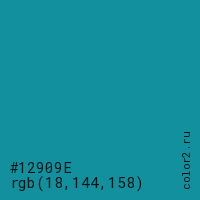 Цвет #12909E в цветовой модели RGB обозначается тремя октетами (18, 144, 158) в десятичном формате и #12909E в шестнадцатиричном (hex) формате, которые являются интенсивностью красного 18 (hex 12), интенсивность зелёного 144 (hex 90) и интенсивность синего 158 (hex 9E).