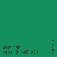 Цвет #12915D в цветовой модели RGB обозначается тремя октетами (18, 145, 93) в десятичном формате и #12915D в шестнадцатиричном (hex) формате, которые являются интенсивностью красного 18 (hex 12), интенсивность зелёного 145 (hex 91) и интенсивность синего 93 (hex 5D).