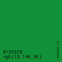 Цвет #129238 в цветовой модели RGB обозначается тремя октетами (18, 146, 56) в десятичном формате и #129238 в шестнадцатиричном (hex) формате, которые являются интенсивностью красного 18 (hex 12), интенсивность зелёного 146 (hex 92) и интенсивность синего 56 (hex 38).