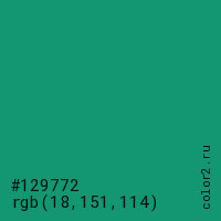 Цвет #129772 в цветовой модели RGB обозначается тремя октетами (18, 151, 114) в десятичном формате и #129772 в шестнадцатиричном (hex) формате, которые являются интенсивностью красного 18 (hex 12), интенсивность зелёного 151 (hex 97) и интенсивность синего 114 (hex 72).