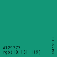 Цвет #129777 в цветовой модели RGB обозначается тремя октетами (18, 151, 119) в десятичном формате и #129777 в шестнадцатиричном (hex) формате, которые являются интенсивностью красного 18 (hex 12), интенсивность зелёного 151 (hex 97) и интенсивность синего 119 (hex 77).