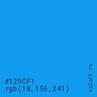 Цвет #129CF1 в цветовой модели RGB обозначается тремя октетами (18, 156, 241) в десятичном формате и #129CF1 в шестнадцатиричном (hex) формате, которые являются интенсивностью красного 18 (hex 12), интенсивность зелёного 156 (hex 9C) и интенсивность синего 241 (hex F1).