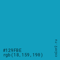 Цвет #129FBE в цветовой модели RGB обозначается тремя октетами (18, 159, 190) в десятичном формате и #129FBE в шестнадцатиричном (hex) формате, которые являются интенсивностью красного 18 (hex 12), интенсивность зелёного 159 (hex 9F) и интенсивность синего 190 (hex BE).