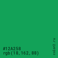 Цвет #12A258 в цветовой модели RGB обозначается тремя октетами (18, 162, 88) в десятичном формате и #12A258 в шестнадцатиричном (hex) формате, которые являются интенсивностью красного 18 (hex 12), интенсивность зелёного 162 (hex A2) и интенсивность синего 88 (hex 58).