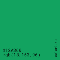 Цвет #12A360 в цветовой модели RGB обозначается тремя октетами (18, 163, 96) в десятичном формате и #12A360 в шестнадцатиричном (hex) формате, которые являются интенсивностью красного 18 (hex 12), интенсивность зелёного 163 (hex A3) и интенсивность синего 96 (hex 60).