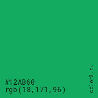 Цвет #12AB60 в цветовой модели RGB обозначается тремя октетами (18, 171, 96) в десятичном формате и #12AB60 в шестнадцатиричном (hex) формате, которые являются интенсивностью красного 18 (hex 12), интенсивность зелёного 171 (hex AB) и интенсивность синего 96 (hex 60).