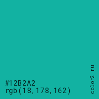 Цвет #12B2A2 в цветовой модели RGB обозначается тремя октетами (18, 178, 162) в десятичном формате и #12B2A2 в шестнадцатиричном (hex) формате, которые являются интенсивностью красного 18 (hex 12), интенсивность зелёного 178 (hex B2) и интенсивность синего 162 (hex A2).