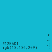 Цвет #12BAD1 в цветовой модели RGB обозначается тремя октетами (18, 186, 209) в десятичном формате и #12BAD1 в шестнадцатиричном (hex) формате, которые являются интенсивностью красного 18 (hex 12), интенсивность зелёного 186 (hex BA) и интенсивность синего 209 (hex D1).