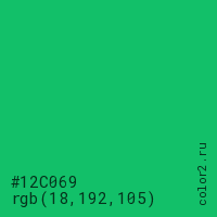 Цвет #12C069 в цветовой модели RGB обозначается тремя октетами (18, 192, 105) в десятичном формате и #12C069 в шестнадцатиричном (hex) формате, которые являются интенсивностью красного 18 (hex 12), интенсивность зелёного 192 (hex C0) и интенсивность синего 105 (hex 69).