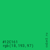 Цвет #12C161 в цветовой модели RGB обозначается тремя октетами (18, 193, 97) в десятичном формате и #12C161 в шестнадцатиричном (hex) формате, которые являются интенсивностью красного 18 (hex 12), интенсивность зелёного 193 (hex C1) и интенсивность синего 97 (hex 61).