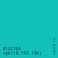 Цвет #12C1BA в цветовой модели RGB обозначается тремя октетами (18, 193, 186) в десятичном формате и #12C1BA в шестнадцатиричном (hex) формате, которые являются интенсивностью красного 18 (hex 12), интенсивность зелёного 193 (hex C1) и интенсивность синего 186 (hex BA).