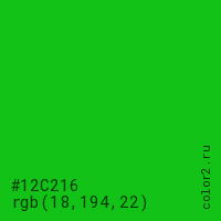 Цвет #12C216 в цветовой модели RGB обозначается тремя октетами (18, 194, 22) в десятичном формате и #12C216 в шестнадцатиричном (hex) формате, которые являются интенсивностью красного 18 (hex 12), интенсивность зелёного 194 (hex C2) и интенсивность синего 22 (hex 16).