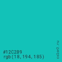 Цвет #12C2B9 в цветовой модели RGB обозначается тремя октетами (18, 194, 185) в десятичном формате и #12C2B9 в шестнадцатиричном (hex) формате, которые являются интенсивностью красного 18 (hex 12), интенсивность зелёного 194 (hex C2) и интенсивность синего 185 (hex B9).