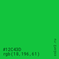 Цвет #12C43D в цветовой модели RGB обозначается тремя октетами (18, 196, 61) в десятичном формате и #12C43D в шестнадцатиричном (hex) формате, которые являются интенсивностью красного 18 (hex 12), интенсивность зелёного 196 (hex C4) и интенсивность синего 61 (hex 3D).
