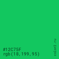 Цвет #12C75F в цветовой модели RGB обозначается тремя октетами (18, 199, 95) в десятичном формате и #12C75F в шестнадцатиричном (hex) формате, которые являются интенсивностью красного 18 (hex 12), интенсивность зелёного 199 (hex C7) и интенсивность синего 95 (hex 5F).