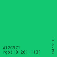Цвет #12C971 в цветовой модели RGB обозначается тремя октетами (18, 201, 113) в десятичном формате и #12C971 в шестнадцатиричном (hex) формате, которые являются интенсивностью красного 18 (hex 12), интенсивность зелёного 201 (hex C9) и интенсивность синего 113 (hex 71).