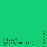 Цвет #12CE74 в цветовой модели RGB обозначается тремя октетами (18, 206, 116) в десятичном формате и #12CE74 в шестнадцатиричном (hex) формате, которые являются интенсивностью красного 18 (hex 12), интенсивность зелёного 206 (hex CE) и интенсивность синего 116 (hex 74).
