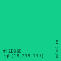 Цвет #12D08B в цветовой модели RGB обозначается тремя октетами (18, 208, 139) в десятичном формате и #12D08B в шестнадцатиричном (hex) формате, которые являются интенсивностью красного 18 (hex 12), интенсивность зелёного 208 (hex D0) и интенсивность синего 139 (hex 8B).