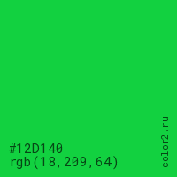 Цвет #12D140 в цветовой модели RGB обозначается тремя октетами (18, 209, 64) в десятичном формате и #12D140 в шестнадцатиричном (hex) формате, которые являются интенсивностью красного 18 (hex 12), интенсивность зелёного 209 (hex D1) и интенсивность синего 64 (hex 40).
