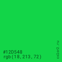 Цвет #12D548 в цветовой модели RGB обозначается тремя октетами (18, 213, 72) в десятичном формате и #12D548 в шестнадцатиричном (hex) формате, которые являются интенсивностью красного 18 (hex 12), интенсивность зелёного 213 (hex D5) и интенсивность синего 72 (hex 48).