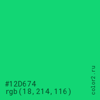 Цвет #12D674 в цветовой модели RGB обозначается тремя октетами (18, 214, 116) в десятичном формате и #12D674 в шестнадцатиричном (hex) формате, которые являются интенсивностью красного 18 (hex 12), интенсивность зелёного 214 (hex D6) и интенсивность синего 116 (hex 74).