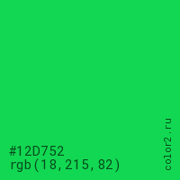Цвет #12D752 в цветовой модели RGB обозначается тремя октетами (18, 215, 82) в десятичном формате и #12D752 в шестнадцатиричном (hex) формате, которые являются интенсивностью красного 18 (hex 12), интенсивность зелёного 215 (hex D7) и интенсивность синего 82 (hex 52).