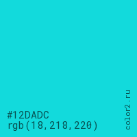 Цвет #12DADC в цветовой модели RGB обозначается тремя октетами (18, 218, 220) в десятичном формате и #12DADC в шестнадцатиричном (hex) формате, которые являются интенсивностью красного 18 (hex 12), интенсивность зелёного 218 (hex DA) и интенсивность синего 220 (hex DC).