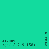 Цвет #12DB9E в цветовой модели RGB обозначается тремя октетами (18, 219, 158) в десятичном формате и #12DB9E в шестнадцатиричном (hex) формате, которые являются интенсивностью красного 18 (hex 12), интенсивность зелёного 219 (hex DB) и интенсивность синего 158 (hex 9E).