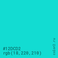 Цвет #12DCD2 в цветовой модели RGB обозначается тремя октетами (18, 220, 210) в десятичном формате и #12DCD2 в шестнадцатиричном (hex) формате, которые являются интенсивностью красного 18 (hex 12), интенсивность зелёного 220 (hex DC) и интенсивность синего 210 (hex D2).