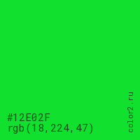 Цвет #12E02F в цветовой модели RGB обозначается тремя октетами (18, 224, 47) в десятичном формате и #12E02F в шестнадцатиричном (hex) формате, которые являются интенсивностью красного 18 (hex 12), интенсивность зелёного 224 (hex E0) и интенсивность синего 47 (hex 2F).