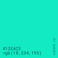 Цвет #12EAC3 в цветовой модели RGB обозначается тремя октетами (18, 234, 195) в десятичном формате и #12EAC3 в шестнадцатиричном (hex) формате, которые являются интенсивностью красного 18 (hex 12), интенсивность зелёного 234 (hex EA) и интенсивность синего 195 (hex C3).
