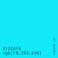 Цвет #12EAF8 в цветовой модели RGB обозначается тремя октетами (18, 234, 248) в десятичном формате и #12EAF8 в шестнадцатиричном (hex) формате, которые являются интенсивностью красного 18 (hex 12), интенсивность зелёного 234 (hex EA) и интенсивность синего 248 (hex F8).