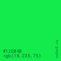 Цвет #12EB4B в цветовой модели RGB обозначается тремя октетами (18, 235, 75) в десятичном формате и #12EB4B в шестнадцатиричном (hex) формате, которые являются интенсивностью красного 18 (hex 12), интенсивность зелёного 235 (hex EB) и интенсивность синего 75 (hex 4B).